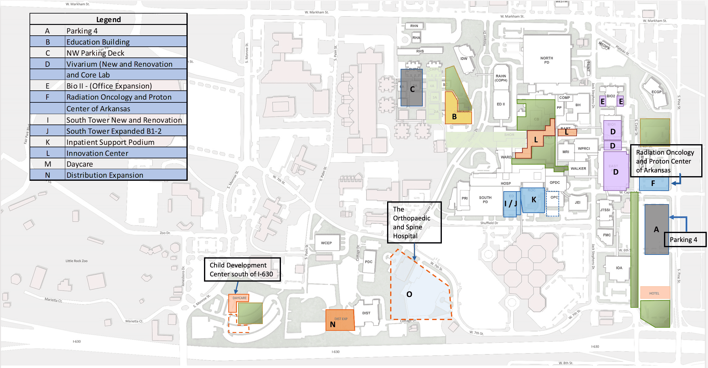 As the health care needs of the people of Arkansas have grown, so have facilities at UAMS. Growth in recent years has been robust with a wide array of new facilities opening since Chancellor Patterson arrived in 2018. Those have included the new East Central Energy Plant, The Orthopaedic and Spine Hospital, the Urology Center, the Proton Center of Arkansas, the Family Medical Center at UAMS East, a new Radiation Oncology Center, the Child Development Center, the cancer clinic and infusion center at Baptist Health, the state’s only Milk Bank and the Orthopaedic Clinic in North Little Rock. Construction will begin in 2024 on a new sports performance center in Northwest Arkansas.