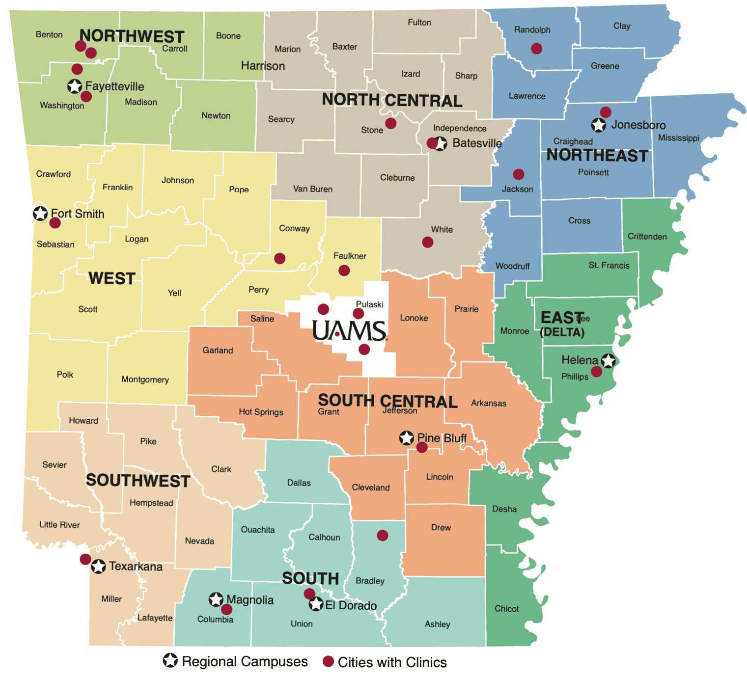 That medical school has evolved into what is now UAMS, the state’s only health sciences university with a physical footprint reaching across the state. That footprint includes the main campus and various clinics in Little Rock, nine regional campuses, 11 Kids First Sites, six Head Start sites, and a variety of pediatric and adult specialty clinics serving the people of Arkansas.