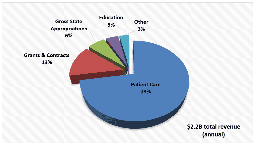 UAMS relies heavily on the margin it generates from the clinical enterprise to cross-subsidize its other mission areas of research and education. Unlike other state supported universities in Arkansas who receive a major portion of funding from the state, UAMS must generate income from its clinical enterprise to subsidize education and research. State appropriation amounts to only 5.7 percent of UAMS’ budget funding. In FY 2024, patient care revenue amounted to 73% of UAMS’ revenue.