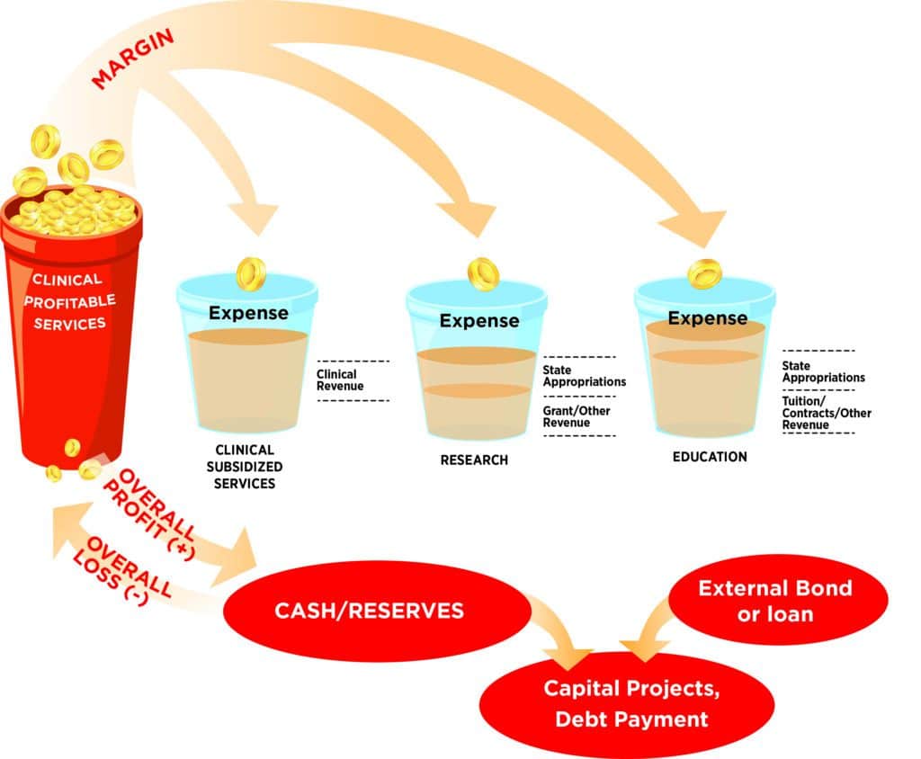 Figure 1 below depicts an overview of UAMS’ funds flow. Each bucket represents a mission area. For clinical there are two buckets, profitable and